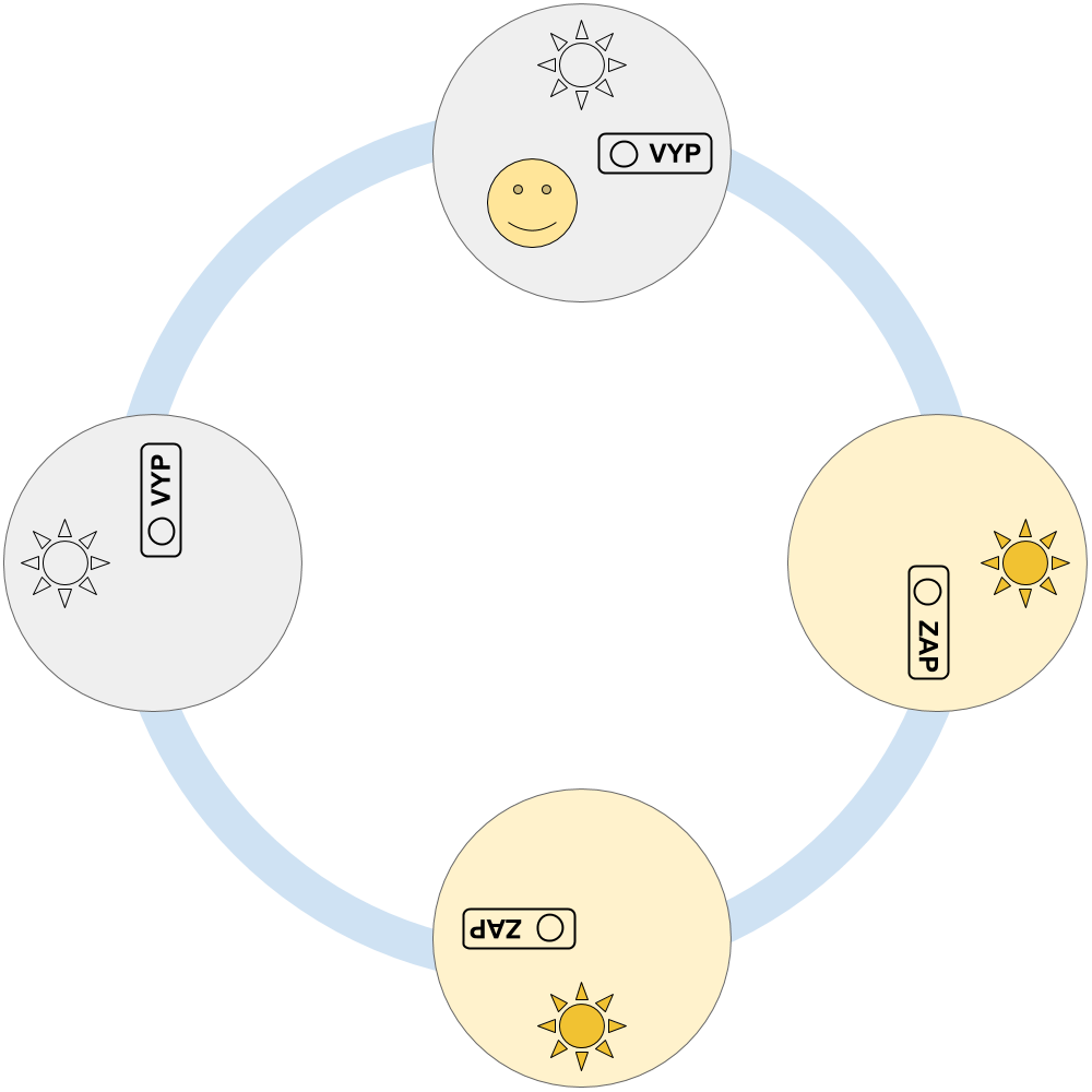 Na obrázku nižšie je jednoduchý systém so štyrmi miestnosťami. Mário sa nachádza v hornej z nich a v miestnosti je aktuálne zhasnuté.