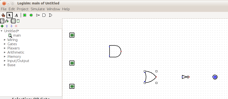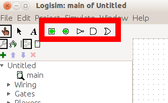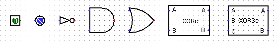 Zľava doprava sú to: vstupný pin, výstupný pin, hradlo NOT, hradlo AND, hradlo OR, hradlo XORc a hradlo XOR3c. Vstupné piny reprezentujú vstupy nášho obvodu a výstupné piny reprezentujú jeho výstupy.