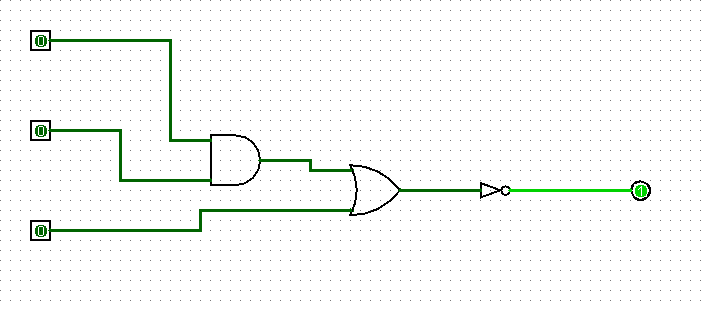 Takýmto spôsobom vieme poprepájať hradlá (a piny) v našom obvode. Logisim na začiatku vždy predpokladá, že na vstupoch nášho obvodu sú samé nuly (preto sú aj v našich vstupných pinoch napísané nuly). Keď máme všetko správne pospájané, vysvieti káble, ktorými ide hodnota 1 svetlozelenou farbou. Vo výstupných pinoch tiež zobrazí ich hodnotu.