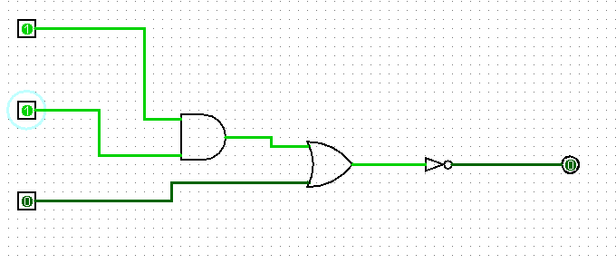 Nakoniec, nástrojom ruky (ktorý nájdete hneď naľavo od nástroja šípky) môžeme klikať na jednotlivé vstupné piny a tým meniť hodnoty v nich. Logisim nám potom vždy vysvieti tie vodiče, v ktorých je hodnota 1.